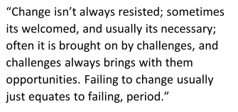 Change isn’t always resisted; sometimes its welcomed, and usually its necessary; often it is brought on by challenges, and challenges always brings with them opportunities. Failing to change usually just equates to failing, period.