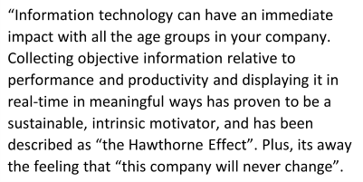 Information technology can have an immediate impact with all the age groups in your company. Collecting objective information relative to performance and productivity and displaying it in real-time in meaningful ways has proven to be a sustainable, intrinsic motivator, and has been described as “the Hawthorne Effect”. Plus, its away the feeling that “this company will never change”.